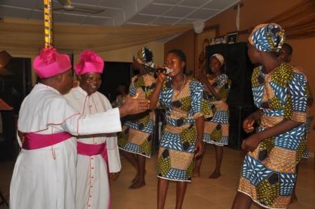 Bishop Badejo with the Silver Jubilarians and Msgr Yakubu cutting the anniversary cake.